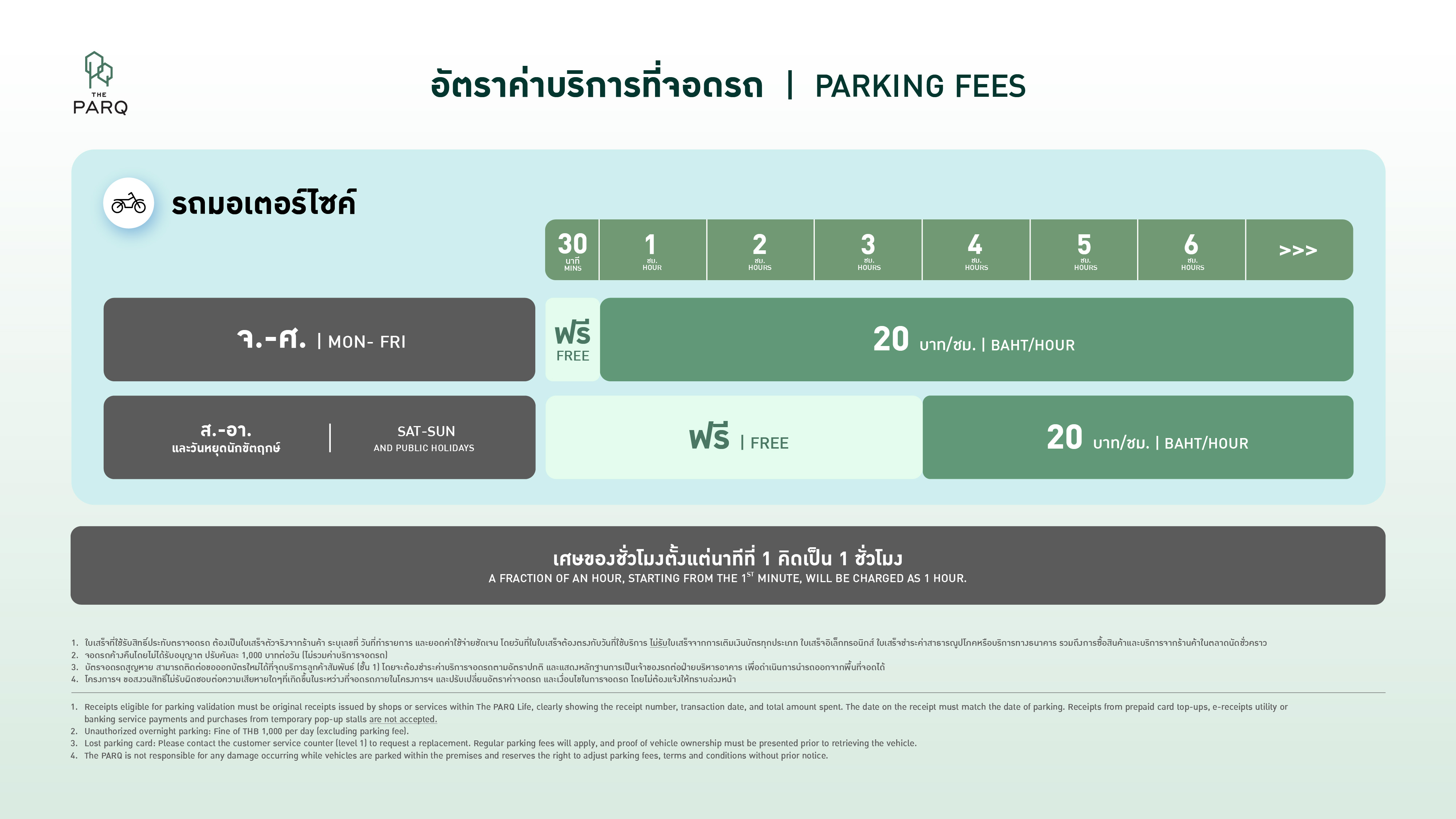 – Free for the first 3 hours* when presenting receipts of 500 baht and above (maximum 3 combined receipts).