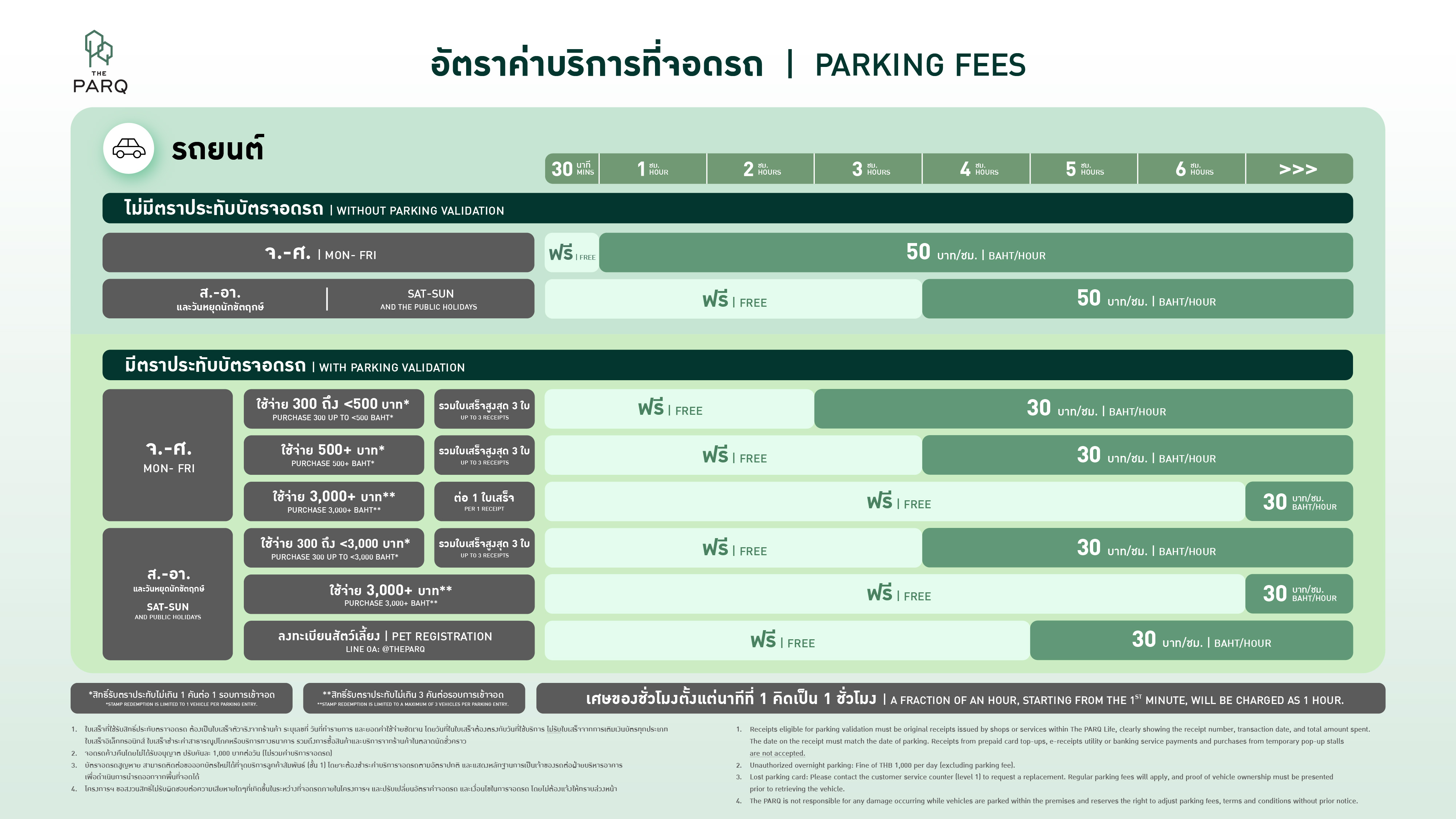 – Free for the first 6 hours** when presenting receipts of 3,000 baht and above